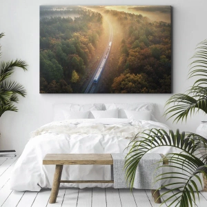 Tabloul pe pânză „Călătorie de toamnă” este o scenă unică, plină de farmec și pace. Înfățișează un tren care călătorește printr-o pădure de toamnă în zori, înconjurat de culorile calde ale frunzelor și o ceață delicată. Vederea de sus evidențiază frumusețea peisajului, creând o atmosferă de armonie și liniște.