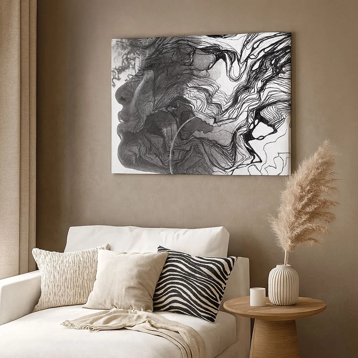 Tablou pe pânză Canvas - Față abstractă în alb și negru cu linii dinamice. - 70x50cm - Încurcată în vise - Decorațiune modernă pentru perete pentru living și dormitor ARTTOR
