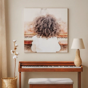 - Pictura înfățișează o fată cu părul bogat și creț, așezată la pian. Compoziția prezintă nuanțe pastelate delicate, creând o atmosferă de căldură și liniște. Este un plus perfect pentru interioarele clasice sau moderne.