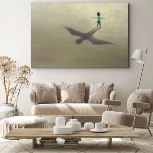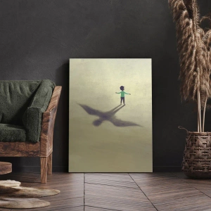 - Acest tablou înfățișează un copil cu umbra unei păsări pe un fundal în tonuri calde. Perfect pentru interioare inspirate de simbolism și liniște. Imprimeul pe pânză măsoară 70x50 cm.