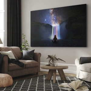 - Această imprimare pe pânză înfățișează o persoană meditând în fața unei cascade, înconjurată de un cer nocturn plin de stele. Perfectă pentru un interior relaxant.