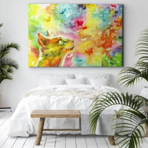 - O imprimare pe pânză în stil acuarelă, cu o pisică înconjurată de fluturi colorați. Perfectă pentru interioare pline de armonie și bucurie.