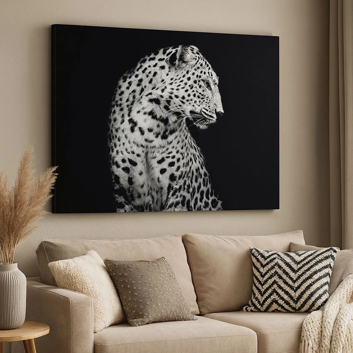 Acest tablou va fi un punct focal perfect într-un living, dormitor sau birou. Stilul său monocromatic îi permite să se potrivească cu ușurință cu diverse scheme de culori interioare. Este, de asemenea, o idee de cadou perfectă pentru iubitorii de animale sălbatice și design elegant.