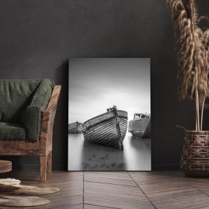 - Pictura înfățișează bărci abandonate care se odihnesc pe o suprafață calmă a apei, într-o estetică alb-negru. Un peisaj subtil plin de nostalgie și reflecție, perfect pentru interioare minimaliste sau clasice.