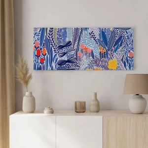 Compoziția grafică, bogată în detalii și diverse elemente vegetale, surprinde frumusețea naturii într-o formă artistică. Accentele de albastru, verde, galben și portocaliu creează o paletă de culori armonioasă care se potrivește perfect interioarelor moderne, minimaliste și eclectice.