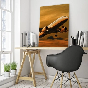 Tablou pe sticlă - Un avion decolează pe un cer portocaliu - 70x50cm - Zbor spre soare - Decorațiune modernă pentru perete pentru living și dormitor ARTTOR