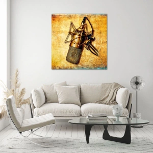 - Această pictură artistică înfățișează un microfon auriu pe un fundal vintage în tonuri calde. Este decorațiunea perfectă pentru iubitorii de muzică și artă.