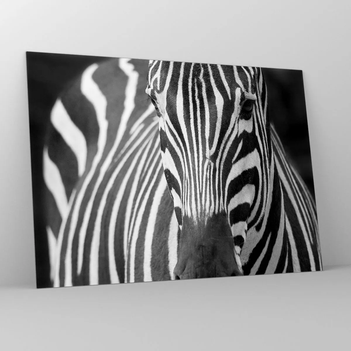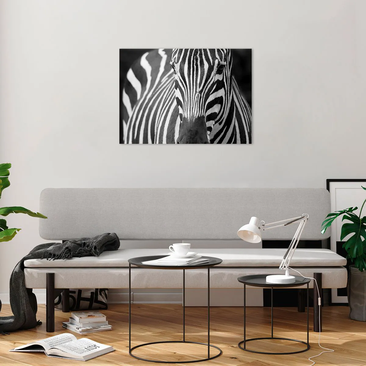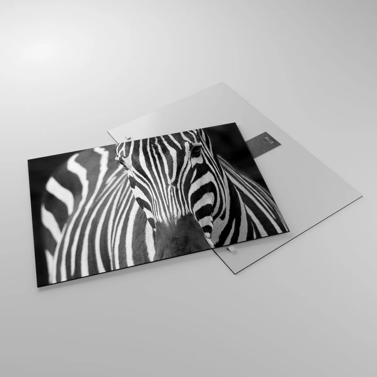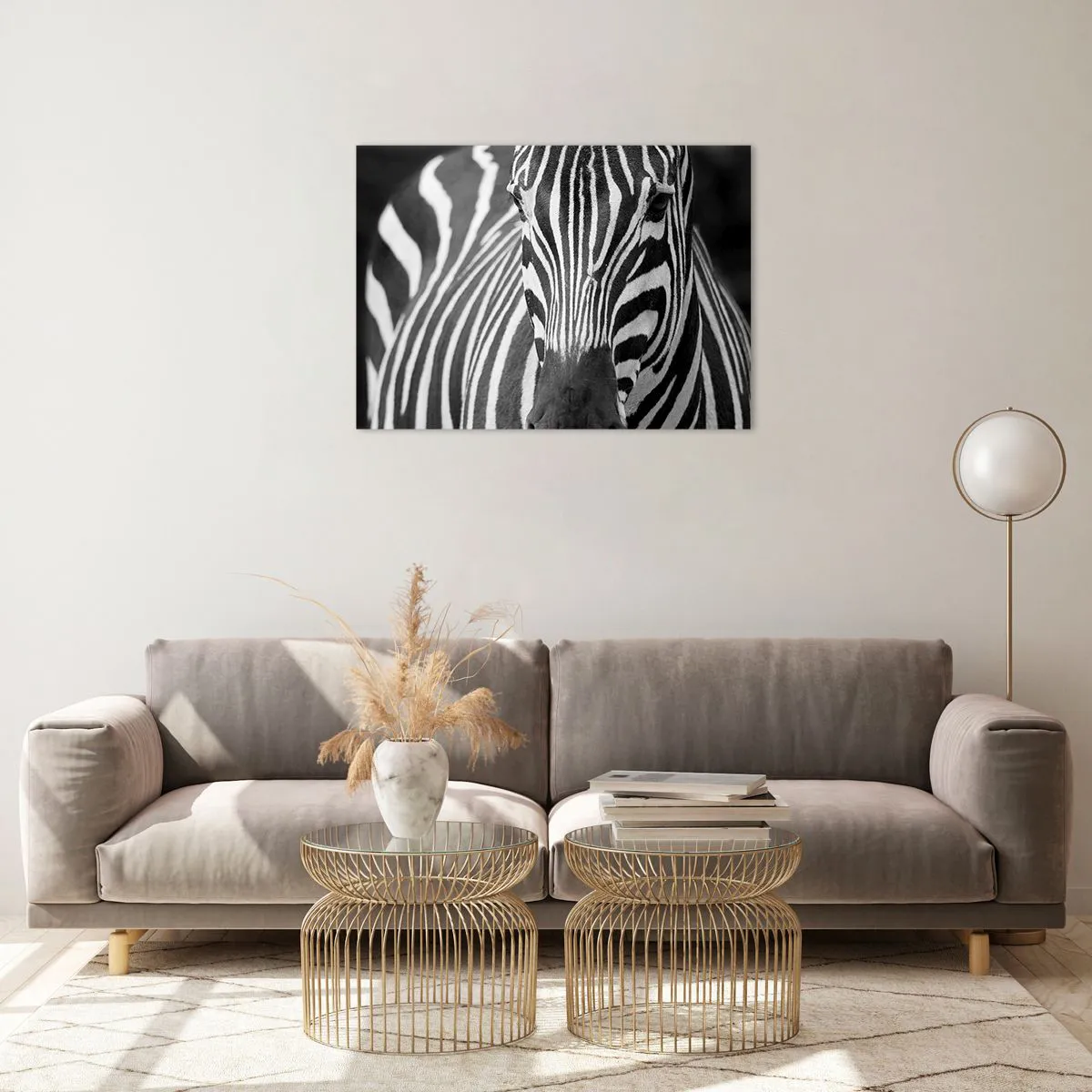 Tablou pe sticlă - Portret alb-negru al unei zebre cu dungi vizibile - 70x50cm - Lumea e albă și neagră - Decorațiune modernă pentru perete pentru living și dormitor ARTTOR