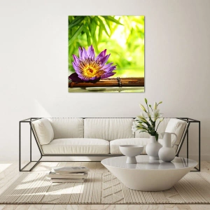 - O floare de lotus violet așezată pe o placă de bambus, înconjurată de un fundal verde al naturii. Un motiv delicat care aduce pace și armonie interiorului, inspirat de exotism și stilul Zen.