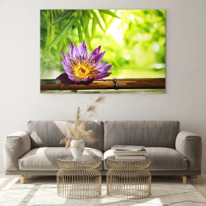 Tablou pe sticlă - Floare de lotus violet pe o placă de bambus cu fundal verde - 70x50cm - În soarele asiatic - Decorațiune modernă pentru perete pentru living și dormitor ARTTOR