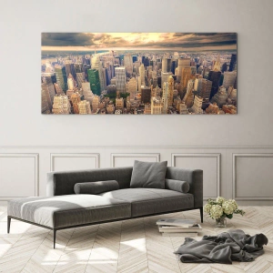 - O panoramă uimitoare a orașului, cu zgârie-nori scăldați în culorile calde ale soarelui care apune. O decorațiune perfectă din sticlă pentru iubitorii de arhitectură modernă.