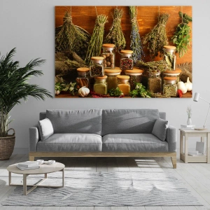 Imprimeul „Ierburi și condimente în borcane pe fundal de lemn” introduce o atmosferă naturală și rustică în interior. Elementul central al compoziției sunt borcanele umplute cu diverse condimente, așezate pe o suprafață de lemn. În fundal sunt vizibile mănunchiuri de ierburi uscate, care îmbogățesc suplimentar ansamblul cu un caracter autentic.
