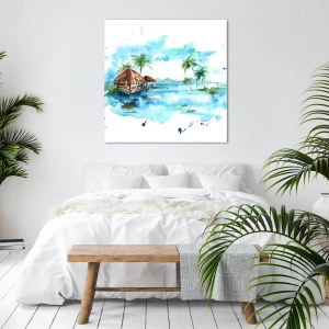 - Această pictură înfățișează un peisaj tropical cu o ilustrație în acuarelă a unor căsuțe și palmieri pe apă. Este completarea perfectă pentru interioarele inspirate de natură și exotic.