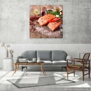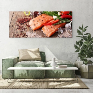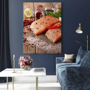 Tablou pe sticlă - Fileuri de somon cu condimente pe blat de lemn - 70x50cm - O aventură norvegiană în bucătărie - Decorațiune modernă pentru perete pentru living și dormitor ARTTOR
