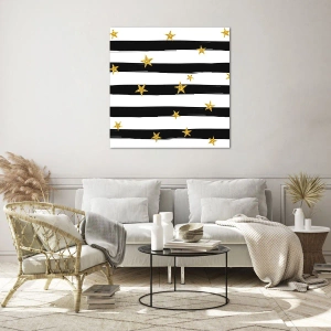 Tablou pe sticlă - Dungi albe și negre cu stele aurii - 70x50cm - Cu toții ne-am născut sub o stea norocoasă - Decorațiune modernă pentru perete pentru living și dormitor ARTTOR