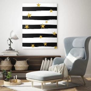 - Grafică modernă cu dungi alb-negre și steluțe aurii, perfectă ca decorațiune interioară cu un stil elegant și modern.