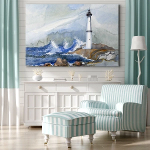 - Această pictură în acuarelă înfățișează un far pe un țărm stâncos, înconjurat de o mare turbulentă. Perfectă pentru interioare inspirate de natură.