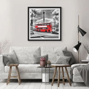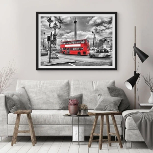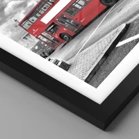 Poster în ramă neagră - Un autobuz roșu pe fundalul unui oraș alb-negru - 50x70cm - Adevărata forță vitală a orașului - Decorațiune modernă pentru perete pentru living și dormitor ARTTOR