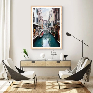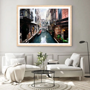 Poster în ramă de stejar deschis - Peisaj venețian cu gondolă și pod - 91x61 cm