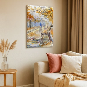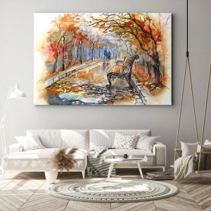 Tablou pe pânză Canvas - Un parc de toamnă cu o bancă în acuarelă - 70x50cm - Pășim împreună în toamnă - Decorațiune modernă pentru perete pentru living și dormitor ARTTOR
