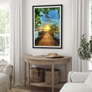 • Acest poster înfățișează un dig de lemn peste un lac liniștit la apus, creând o atmosferă armonioasă și relaxantă. Perfect pentru iubitorii de natură și de decor elegant.
