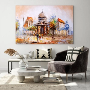 Tablou pe sticlă - O stradă pitorească a orașului, cu o clădire istorică în fundal - 70x50cm - O plimbare pariziană - Decorațiune modernă pentru perete pentru living și dormitor ARTTOR