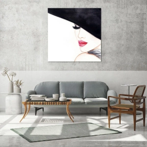 Această imprimare pe sticlă de 70x50cm, intitulată Eleganță și senzualitate, este o decorațiune murală unică, care atrage atenția prin forma sa minimalistă și stilul sofisticat. Compoziția înfățișează un subtil portret al unei femei cu o pălărie neagră, cu buze roșii evidențiate, care creează un contrast izbitor pe fundalul luminos.