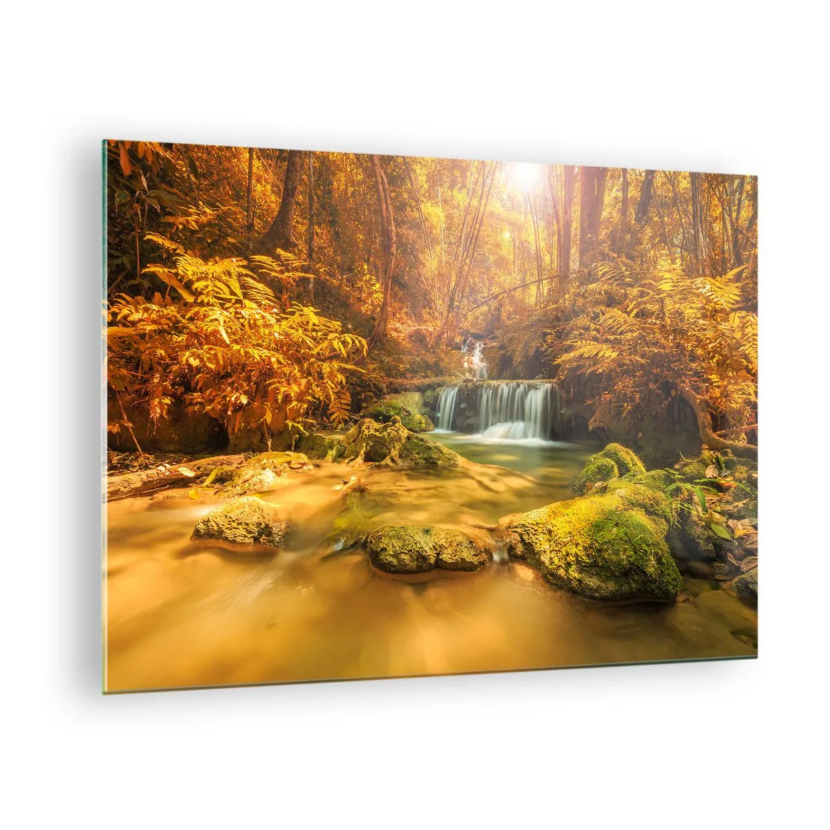 Tablou pe sticlă - Cascadă de pădure aurie - 70x50cm - Cascadă de pădure în aur - Decorațiune modernă pentru perete pentru living și dormitor ARTTOR