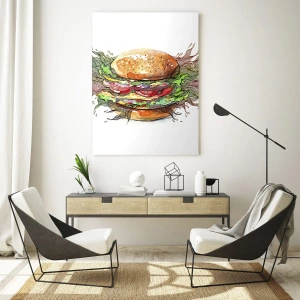 Desenul iese în evidență prin caracterul său artistic, conferind burgerului un aspect unic. Fiecare detaliu, de la o picătură de sos până la textura chiflei, a fost reprodus cu atenție, oferind imaginii o expresie realistă, dar artistică. Stilul acuarelă adaugă lejeritate și umor, făcând din această compoziție o decorațiune interioară perfectă.