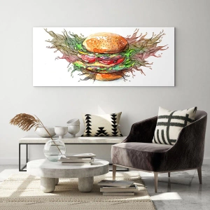 Tablou pe sticlă - Desen artistic al unui burger cu detalii în acuarelă - 70x50cm - Tentație fierbinte - Decorațiune modernă pentru perete pentru living și dormitor ARTTOR