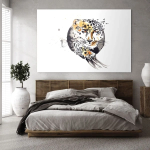 Pictura de 70x50 cm este realizată pe sticlă, conferindu-i eleganță și durabilitate. Detaliile expresive și culorile atent selectate fac din această lucrare un plus ideal pentru interioarele moderne - de la sufragerie până la dormitor. Fundalul minimalist accentuează dinamica și subtilitatea imaginii leopardului, creând o armonie între sălbăticie și liniște.