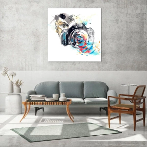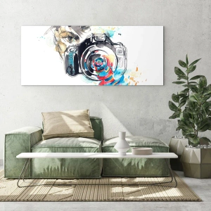 Tabloul de 70x50 cm este realizat pe sticlă, ceea ce îi conferă eleganță și durabilitate. Detaliile expresive ale aparatului foto combinate cu culorile abstracte creează un întreg armonios care se potrivește perfect în interioarele moderne. Această lucrare atrăgătoare și inspiratoare este perfectă atât pentru sufragerie, cât și pentru birou.