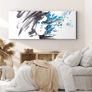 Tablou pe pânză Canvas - Pictură artistică pe față în acuarelă cu accente albastre - 70x50cm - Portret senzual în gri și albastru - Decorațiune modernă pentru perete pentru living și dormitor ARTTOR
