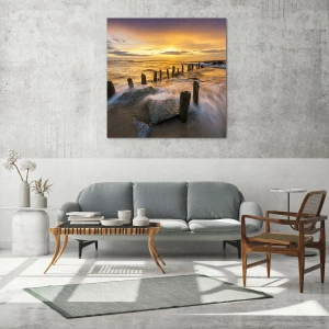 - Această pictură înfățișează un apus de soare peste mare, cu piloni de lemn pe plajă și valuri line. Este decorațiunea perfectă pentru un interior relaxant.