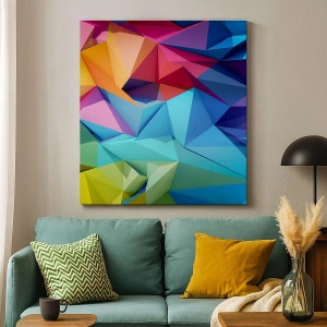 - Pictura pe pânză prezintă o abstracție geometrică dinamică în culori vibrante. Modelele triunghiulare și o paletă de culori intense conferă piesei o notă modernă.