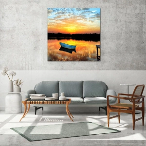 - Această pictură înfățișează o barcă plutind pe un lac liniștit în razele soarelui care apune. Este o decorațiune perfectă pentru iubitorii de natură și peisaje reflexive.