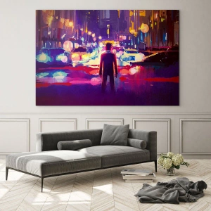 Tablou pe sticlă - O figură într-o lumină de noapte colorată, în stil futurist, a orașului - 70x50cm - Scufundat în lumină - Decorațiune modernă pentru perete pentru living și dormitor ARTTOR