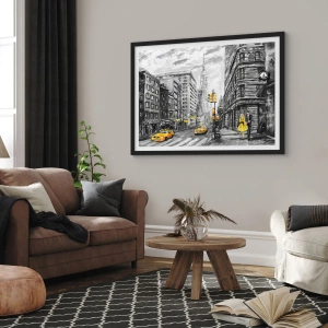 - Acest poster înfățișează o stradă din New York cu taxiuri galbene și arhitectură în fundal. Este completarea perfectă pentru un interior modern, accentuând atmosfera unei metropole urbane. Este inclusă o ramă neagră.
