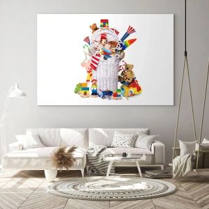 Tablou pe sticlă - Un coș plin de jucării colorate pe un fundal alb - 70x50cm - Comorile micuțului - Decorațiune modernă pentru perete pentru living și dormitor ARTTOR