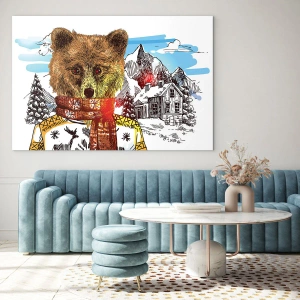 - Un urs purtând un pulover și o eșarfă ornamentate, înfățișat pe fundalul unui peisaj pitoresc de iarnă, cu o cabană montană. Această ilustrație este realizată într-un stil artistic, perfectă pentru decorarea interioară.