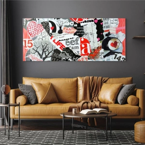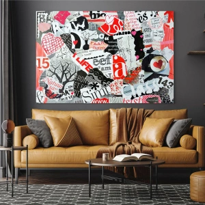 Tabloul pe sticlă „Colaj artistic” este o compoziție modernă care atrage atenția prin diversitatea și contrastul său. Modelul este alcătuit din elemente precum litere, inimi, copaci și forme geometrice, conferindu-i un caracter unic. Schema de culori se bazează pe un contrast puternic de negru, alb și roșu, care accentuează și mai mult expresia și profunzimea imaginii.