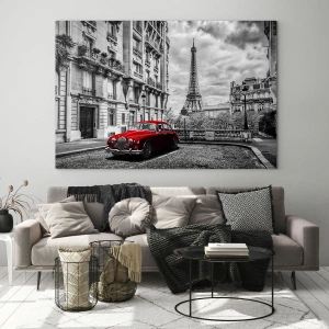 Tablou de perete - Mașină roșie în Paris - O mașină roșie cu Turnul Eiffel în fundal, în Paris alb-negru