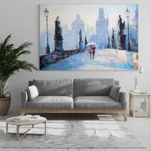 - Un tablou romantic care înfățișează un cuplu plimbându-se cu umbrele pe un pod istoric într-o zi ploioasă. Această compoziție subtilă în nuanțe pastelate este perfectă pentru interioare clasice și elegante.