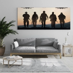 - Această pictură dinamică înfățișează siluetele soldaților pe fundalul unui apus de soare și al unor avioane în zbor. O scenă plină de simbolism și putere, este perfectă pentru interioare moderne sau cu tematică militară.