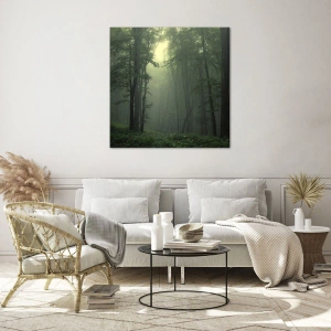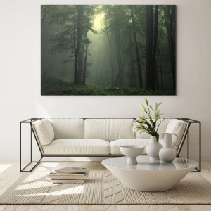 Pictura a fost imprimată pe sticlă în format 70x50 cm, ceea ce subliniază aspectul său modern și elegant. Tehnologia de imprimare pe sticlă asigură reproducerea perfectă a detaliilor - de la textura frunzelor până la tranzițiile tonale subtile ale luminii și umbrei. Suprafața lucioasă adaugă profunzime și intensifică efectul unui peisaj realist, făcând pădurea să pară aproape vie.