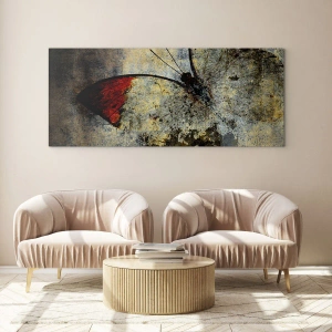 Imprimarea pe sticlă asigură o calitate înaltă, surprinzând fiecare detaliu al picturii și scoțând în evidență plenitudinea culorilor. **Forma abstractă a unui fluture** pe un fundal de material învechit este o combinație de modernitate și stil clasic, creând un accent artistic unic.