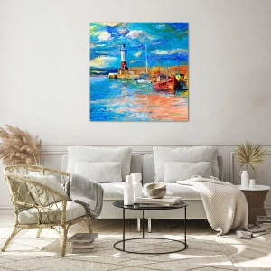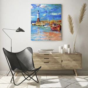 - Pictura înfățișează un golf în culorile curcubeului, cu un far și bărci colorate. Un peisaj atmosferic, perfect pentru o sufragerie sau un birou.