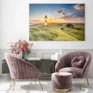 - Pictura înfățișează un far la apusul soarelui deasupra unei mări furtunoase. Un peisaj atmosferic, perfect pentru o sufragerie sau un birou.