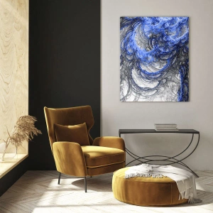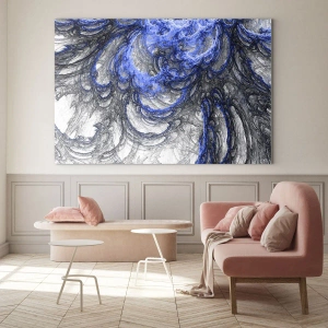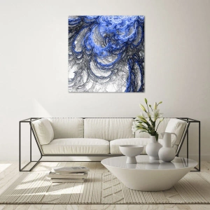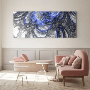 - Această imprimare pe sticlă de 70x50 cm prezintă o abstracție dinamică în nuanțe de albastru și gri. Perfectă pentru interioare moderne, cu un caracter unic.