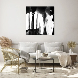Tablou pe sticlă - Siluetă alb-negru a unui cuplu elegant noir - 70x50cm - Într-o atmosferă noir - Decorațiune modernă pentru perete pentru living și dormitor ARTTOR